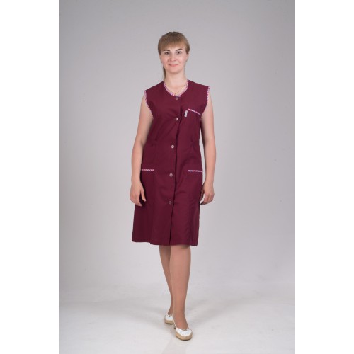 Халат женский без рукавов. Три накладных кармана. Горловина, проймы и карманы отделаны тесьмой или косой бейкой. Специально для теплых помещений.