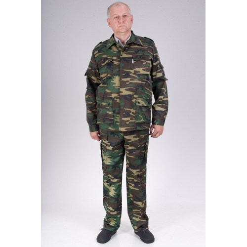 Куртка+брюки. Застежка потайная на пуговицы. На куртке 4 кармана-портфеля на полочках и 2 на рукавах, кулиска, на спинке складки. На брюках 2 боковых кармана и 2 кармана - портфеля. КМФ По желанию заказчика, костюм может быть изготовлен из любых тканей и в различных цветовых решениях.